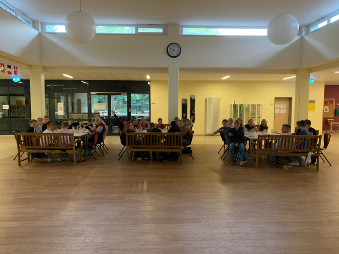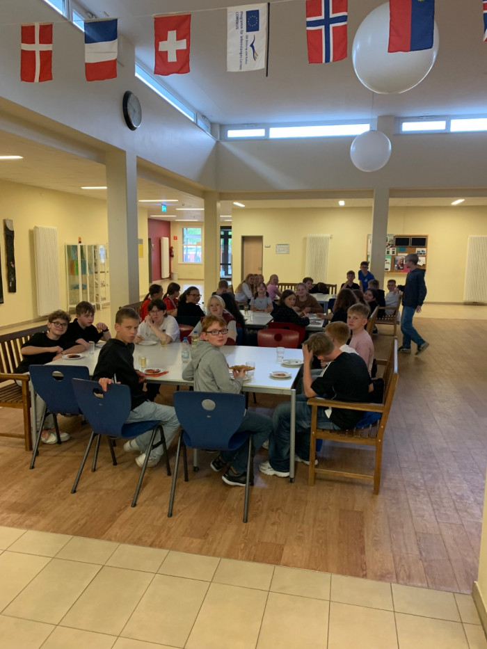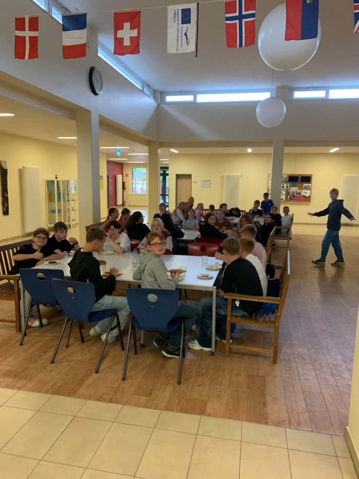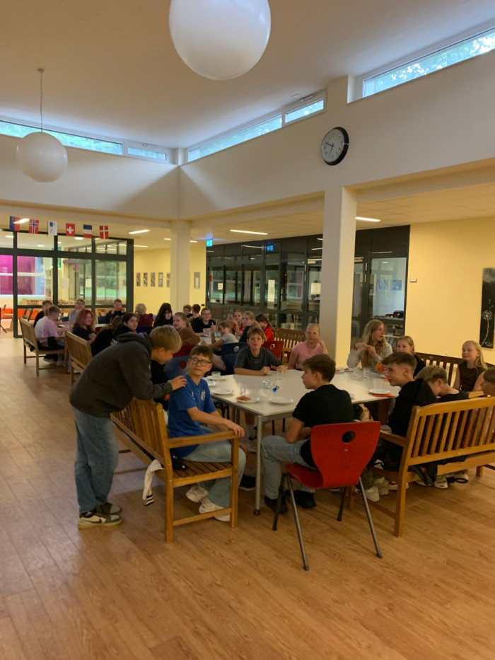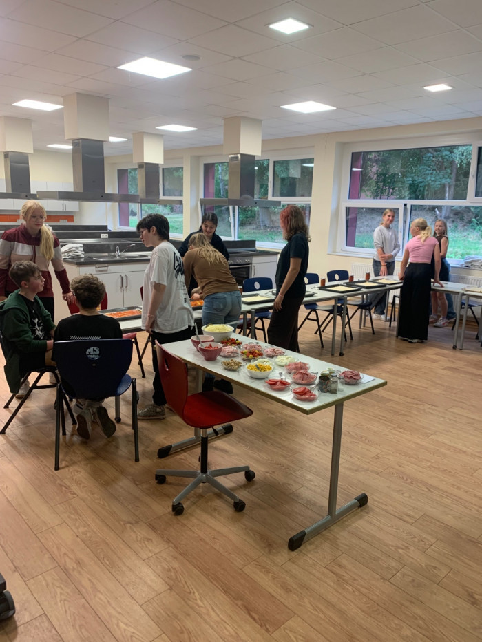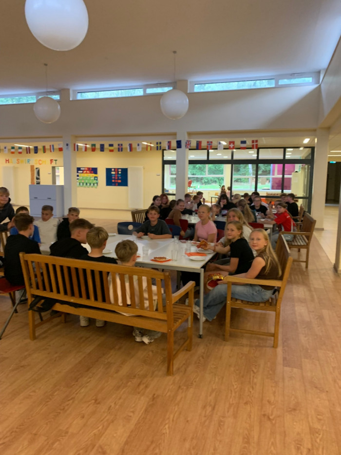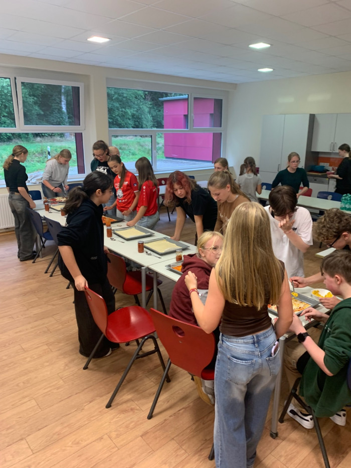 Am 8.10. haben wir uns am frühen Abend mit den Jahrgangsstufen 7 getroffen. Die Schüler haben ihre Pizzen belegt und dann gemeinsam gegessen. Während der Wartezeit wurde Rundlauf gespielt oder sich einfach nur ausgetauscht. Zum Schluss haben wir uns alle die Fotos von der Klassenfahrt angeschaut. Es gab auch etwas zu Naschen, nämlich Chips und Gummibärchen.