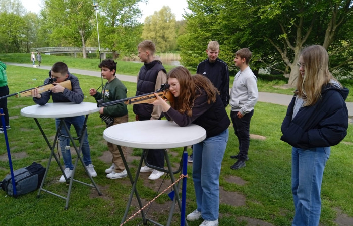 In kleinen Gruppen sollten die SuS verschiedene Aufgaben bewältigen, wie Bälle, die mit einem gespannten Gummi verschossen wurden, auffangen, Bälle auf eine kleine Plattform werfen, Stäbe der Größe nach Sortieren, mit einem Lasergewehr zielen, Biathlon.