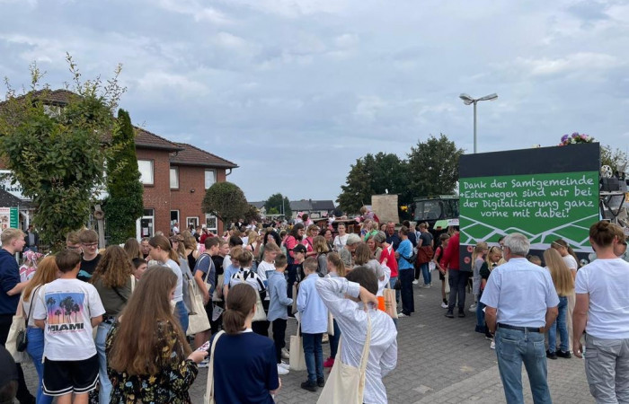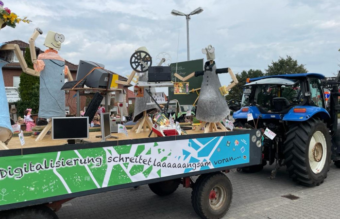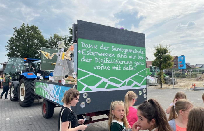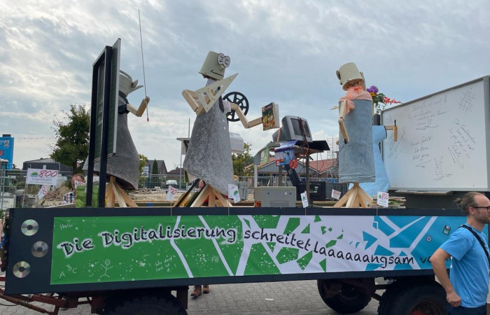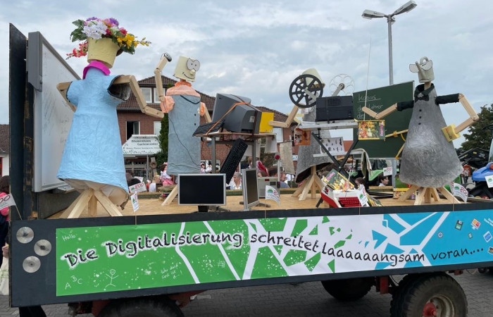 Beim festlichen Umzug  durch den Ortskern waren wir ganz vorne mit dabei und starteten von Position 9. Unser Umzugswagen mit dem Thema „Schule heute- Die Digitalisierung schreitet laaaangsam voran“ wurde von rund 100 Schülerinnen und Schülern sowie dem gesamten Kollegium begleitet.