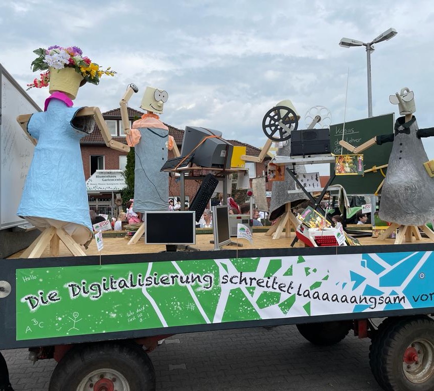 Beim festlichen Umzug  durch den Ortskern waren wir ganz vorne mit dabei und starteten von Position 9. Unser Umzugswagen mit dem Thema „Schule heute- Die Digitalisierung schreitet laaaangsam voran“ wurde von rund 100 Schülerinnen und Schülern sowie dem gesamten Kollegium begleitet.