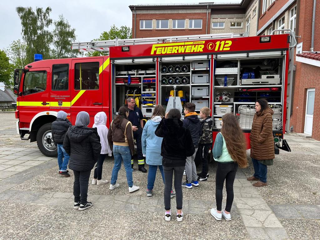 Ebenso war die Feuerwehr Esterwegen mit dem Feuerwehrauto vor Ort und zeigte den Schülern, welche Geräte Feuerwehrmänner in Notsituationen benutzen müssen. Ebenso wurde den Kindern der 5a und 5b anschaulich berichtet, was zu tun ist, wenn es im Haus brennt.