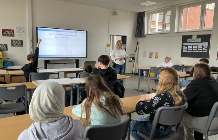 Frau Vinke hatte dann die Möglichkeit, sich an die Erfahrungen der Schülerinnen und Schüler zu orientieren und das vorhandene Wissen zu überprüfen. Ein aufschlussreiches Gespräch wurde gemeinsam geführt, um die folgenden Fragen zu beantworten: Welche Ursachen können jemanden davon abhalten, einzugreifen? Welche Ursachen können dazu führen, dass jemand eingreifen muss?