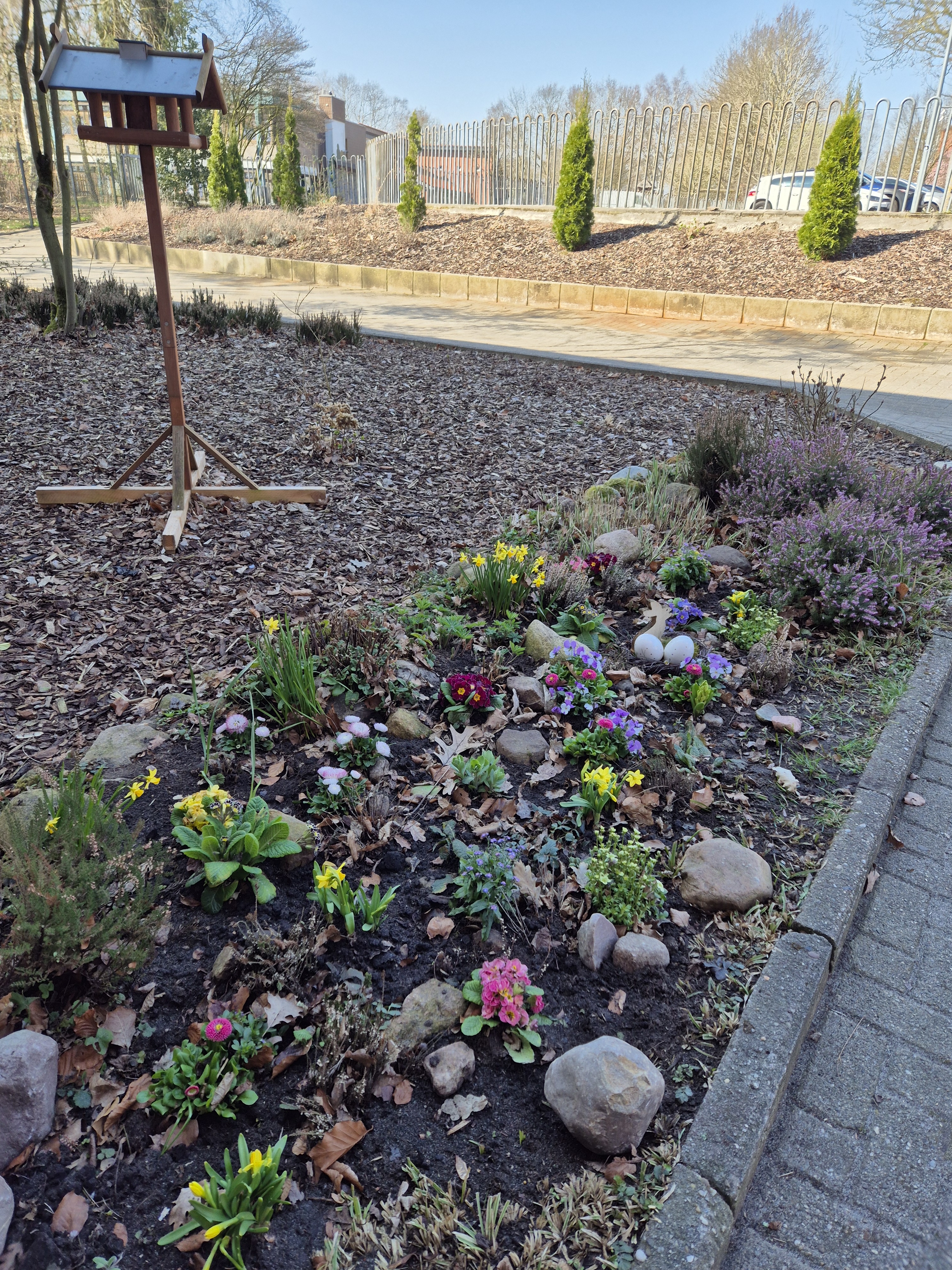 das Beet neben dem Eingang des Verwaltungsgebäudes ‚aufgeräumt‘ und mit blühenden Pflanzen neu bestückt.